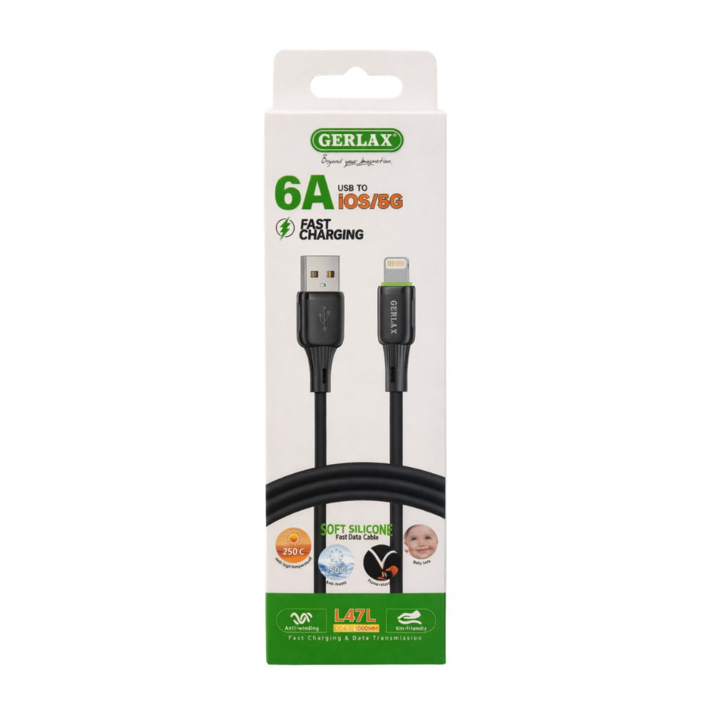 Le câble GERLAX SOFT SILICONE L47L  est conçu pour offrir une charge rapide et puissante à tous vos appareils iPhone. Avec un ampérage de 6A, il garantit une intensité élevée pour une recharge efficace et stable, idéale pour les iPhone, iPad et autres appareils Apple nécessitant une bonne puissance de charge.