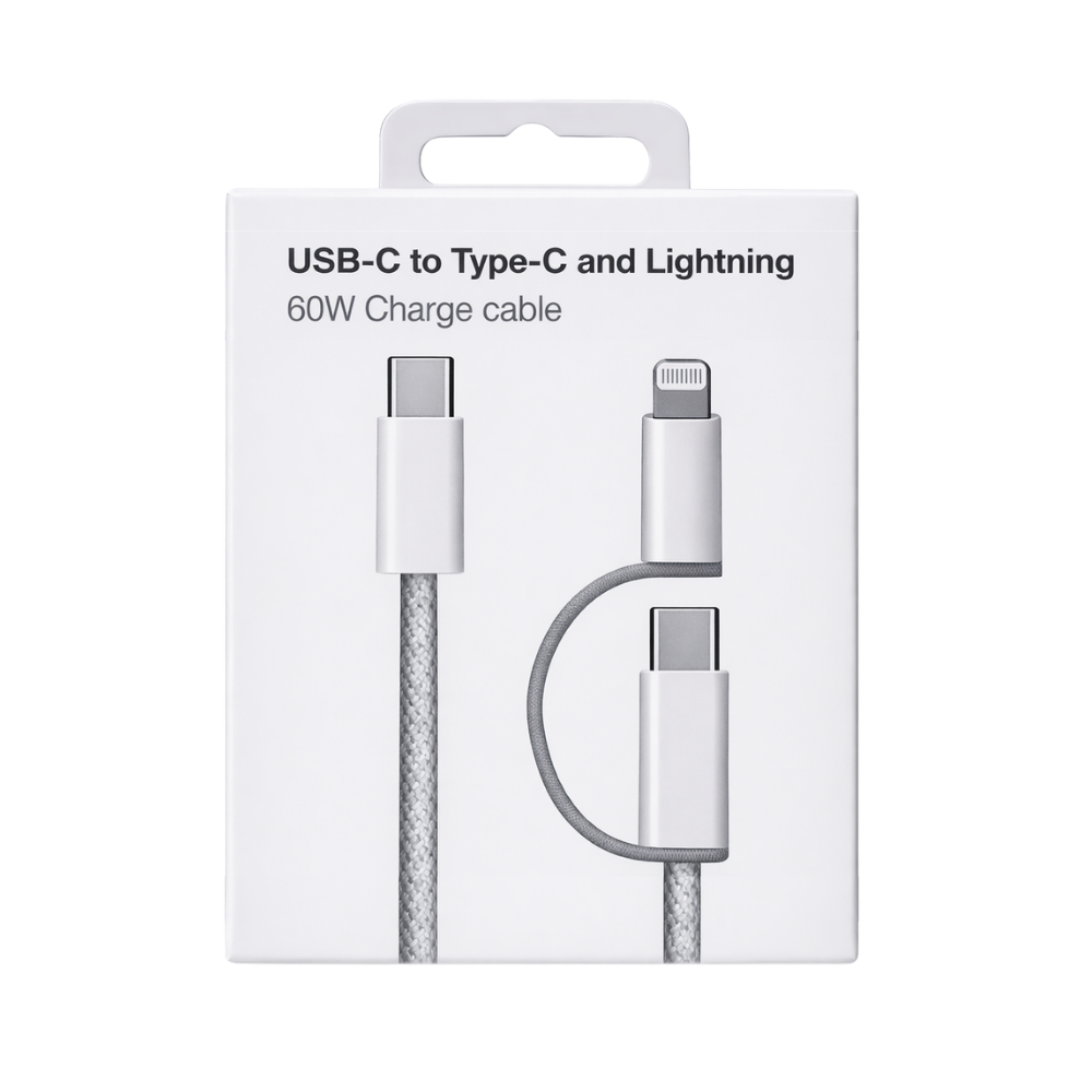Le CABLE USB-C  LIGHTNING (2 IN 1) (1 mètre) est conçu pour offrir une charge rapide haute puissance à tous vos appareils Apple. Avec une capacité de 60W, il permet de recharger votre iPhone, iPad ou iPod à une vitesse optimale, tout en étant compatible avec les chargeurs rapides USB-C. Idéal pour une utilisation quotidienne, à la maison, au bureau ou en déplacement.
