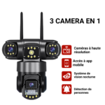 La Caméra Intelligente IPC-V380-SMQ11 est une solution de surveillance performante conçue pour sécuriser vos espaces intérieurs et extérieurs avec une installation simple et rapide. Alimentée par adaptateur secteur DC 12V, elle assure un fonctionnement continu et fiable 24h/24. Son système 3 écrans – 3 vues synchrones offre une vision multi-angle sans angle mort, associé à une vision jour/nuit et une détection couleur pour une identification précise des éléments surveillés. Grâce à sa détection IA humaine, elle distingue intelligemment les personnes des autres mouvements, réduisant ainsi les fausses alertes et optimisant la sécurité. Les notifications en temps réel vous alertent instantanément sur votre smartphone en cas d’intrusion, avec un stockage sécurisé sur carte SD ou dans le cloud. Son indice de protection P68 garantit une résistance optimale à l’eau, à la poussière et aux intempéries, idéale pour une utilisation en extérieur. Polyvalente et fiable, elle convient parfaitement à la surveillance domestique, professionnelle et extérieure.
