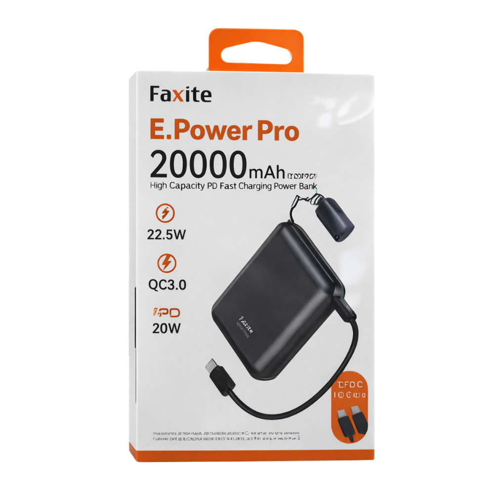 La Power Bank Faxite E20PRO est une batterie externe haut de gamme au boîtier en métal, conçue pour allier performance, design et praticité. Avec sa capacité de 20 000 mAh (77Wh) et son câble USB-C intégré en forme de lanière, elle est idéale pour une utilisation quotidienne ou en voyage. Son écran LED permet de suivre en temps réel le niveau de charge restant, facile a porté.
